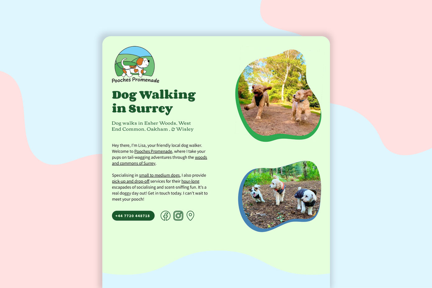 Chris has been an absolute star! My dog walking business needed a serious refresh—outdated logo, no website, and I had no idea where to start. Chris jumped in without hesitation and in just a few weeks, I had a fresh new logo (with a nod to the old one), and a crisp, professional website I'm proud of. He listened, wasn’t pushy, and made the whole process stress-free. I’m a happy dog walker—and the dogs are too!